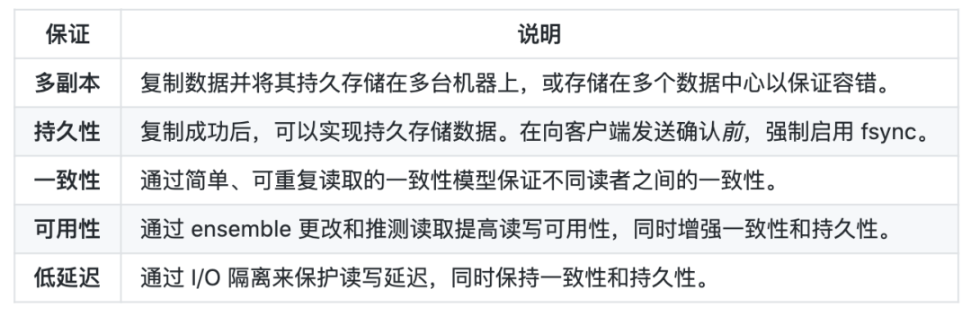 保证复制每条写入 BookKeeper 的数据记录,并持久化到指定数量的 bookies 中。可以通过使用磁盘 fsync 和写入确认来实现。