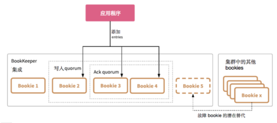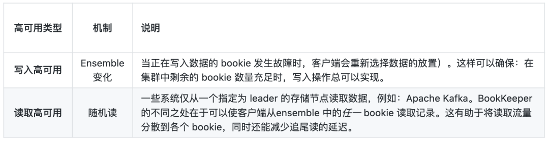 为向 bookies 写入记录提供多种选择,从而确保即使集群中多个 bookies 终止或运行缓慢,写入操作仍然可以完成(只要有足够的容量来处理负载)。可以通过改变 ensemble 来实现。